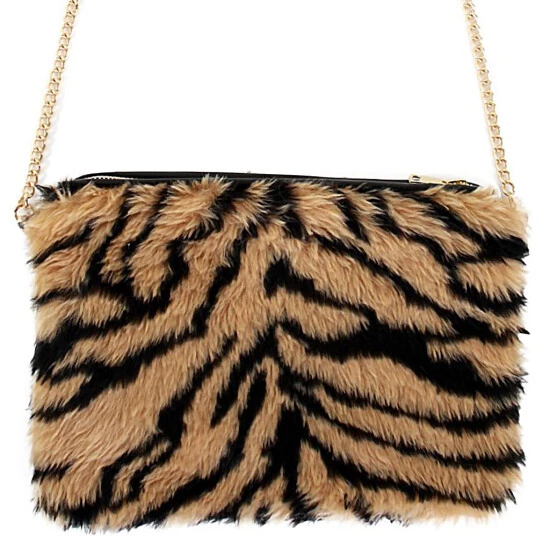 Flauschige Umhängetasche mit Tigermuster in Schwarz und Braun.