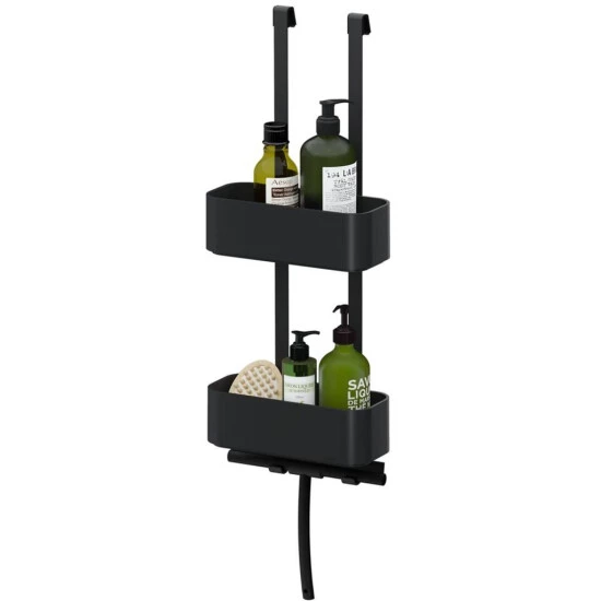 Tiger 2-Store Duschkorb doppelt, Duschablage zum Hngen auf die Duschwand, Montage ohne Bohren, Duschregal mit Ablage fr Duschgel & Co., mit integriertem Haken, Edelstahl, Kunststoff, Farbe: Schwarz