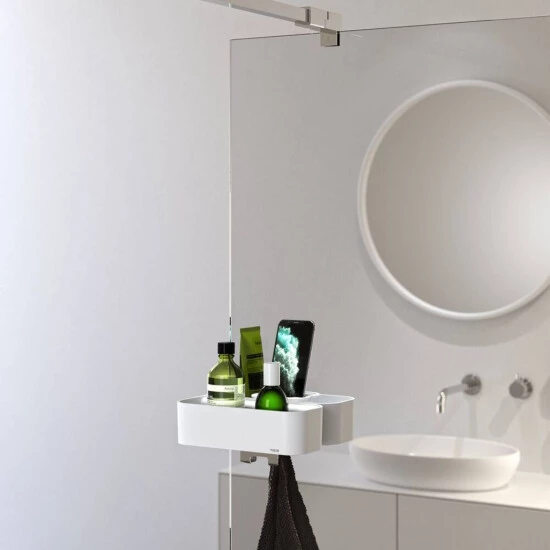 Nicht genug Ablagefläche? Keine Sorge! Mit dem Tiger 2-Store Clip-on-Duschkorb schaffen Sie mehr Platz an der Glaswand. Dieses Produkt punktet durch intelligente und stilvolle Lösungen für mehr Ablagefläche. Sie klicken den Korb einfach auf der Glaswand ein und stellen die Haken noch richtig ein. Das Set enthält außerdem einen Universal-Handyhalter. So erklingt auch Ihre Lieblingsmusik unter der Dusche. 2-Store sorgt für einen modernen Look in Ihrem Badezimmer und ist für eine längere Lebensdauer verstärkt.