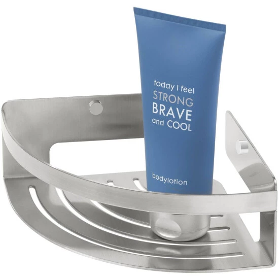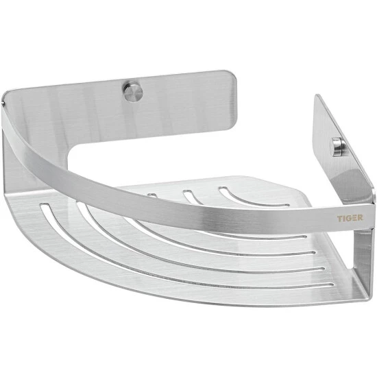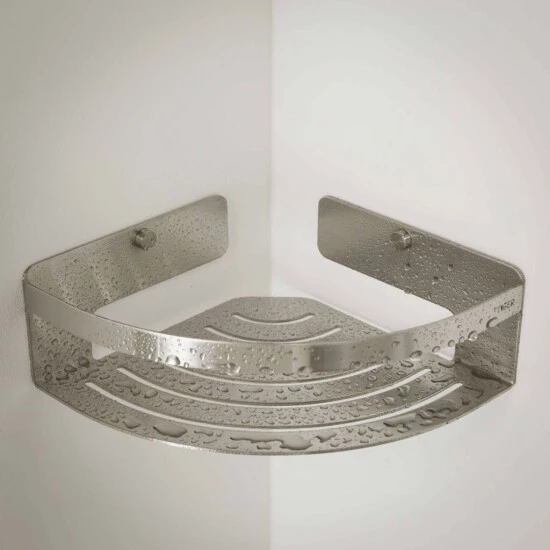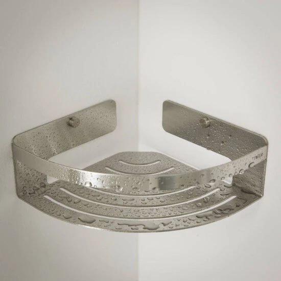 Die elegante Eckablage Caddy von Tiger ist aus gebürstetem Edelstahl gefertigt und bietet eine ideale Aufbewahrungslösung für Shampoo- oder Duschgelflaschen in der Dusche oder im Bad.