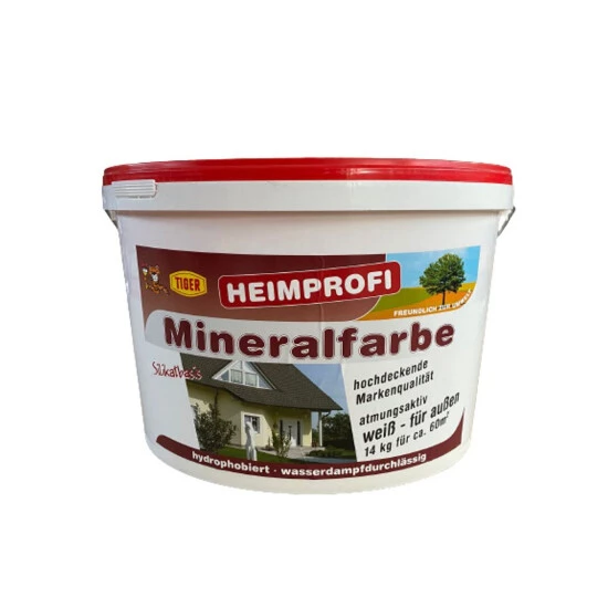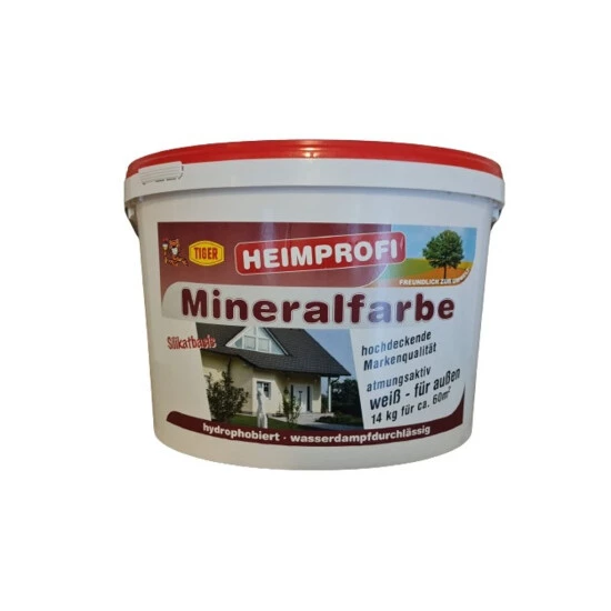 Anwendungsbereich: Für alle Untergründe im Innen- und Aussenbereich – und Altputze, Kalk- und Zementputz, Gas- und Bimsbeton, Kalk-, Sand- und Leichtbetonstein, Ziegel und Klinker etc. Weiteres für die Renovierung von Mineral-, Kalk- und Silikatfarbenanstrichen etc. Neuputze sollen 3-4 Wochen zwecks Abbindung ungestrichen bleiben. Wichtig: Nicht zu streichende Objektteile ( Glas etc.) sorgfältig abdecken. Für Anstriche auf Lack -, Leim- und Dispersionsfarben, Holz und Kunststoffen ist Tiger-Heimprofi-Mineralfarbe nicht geeignet.